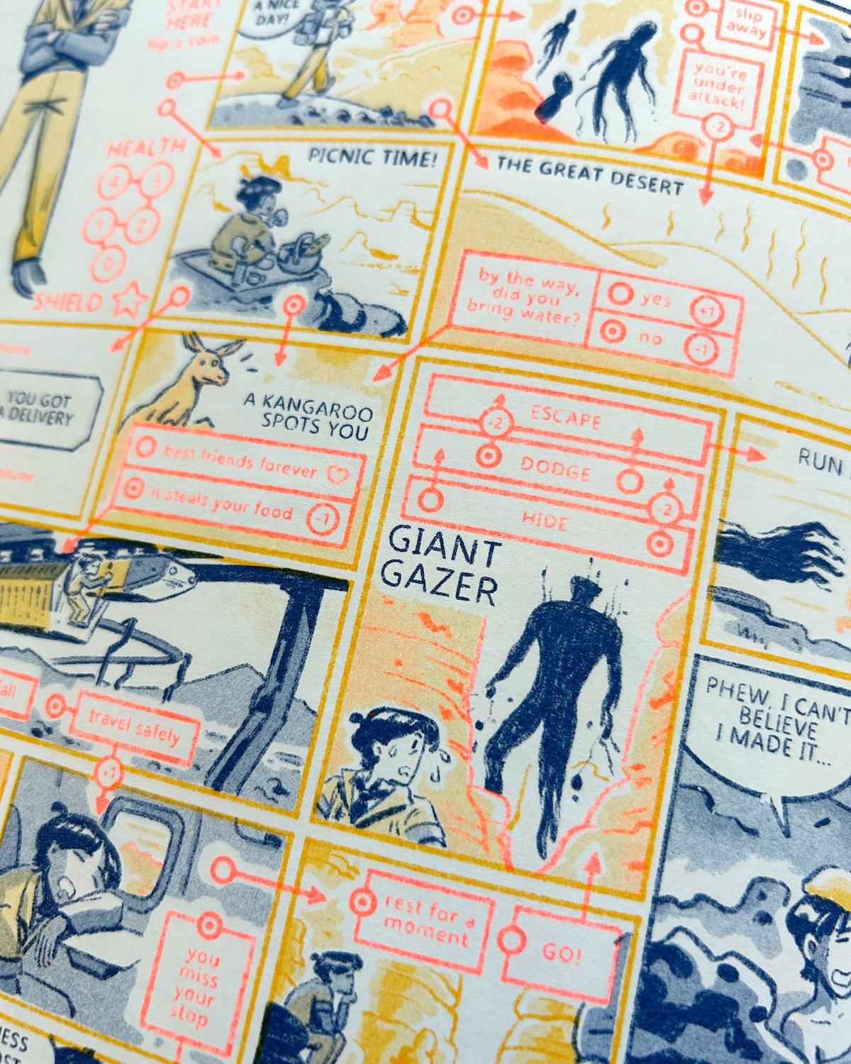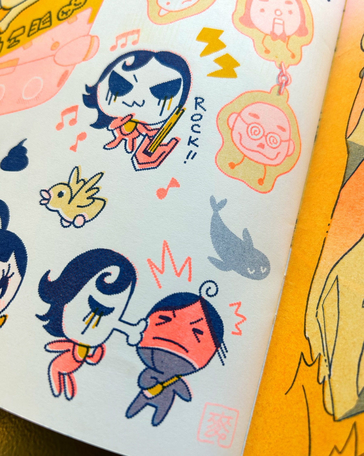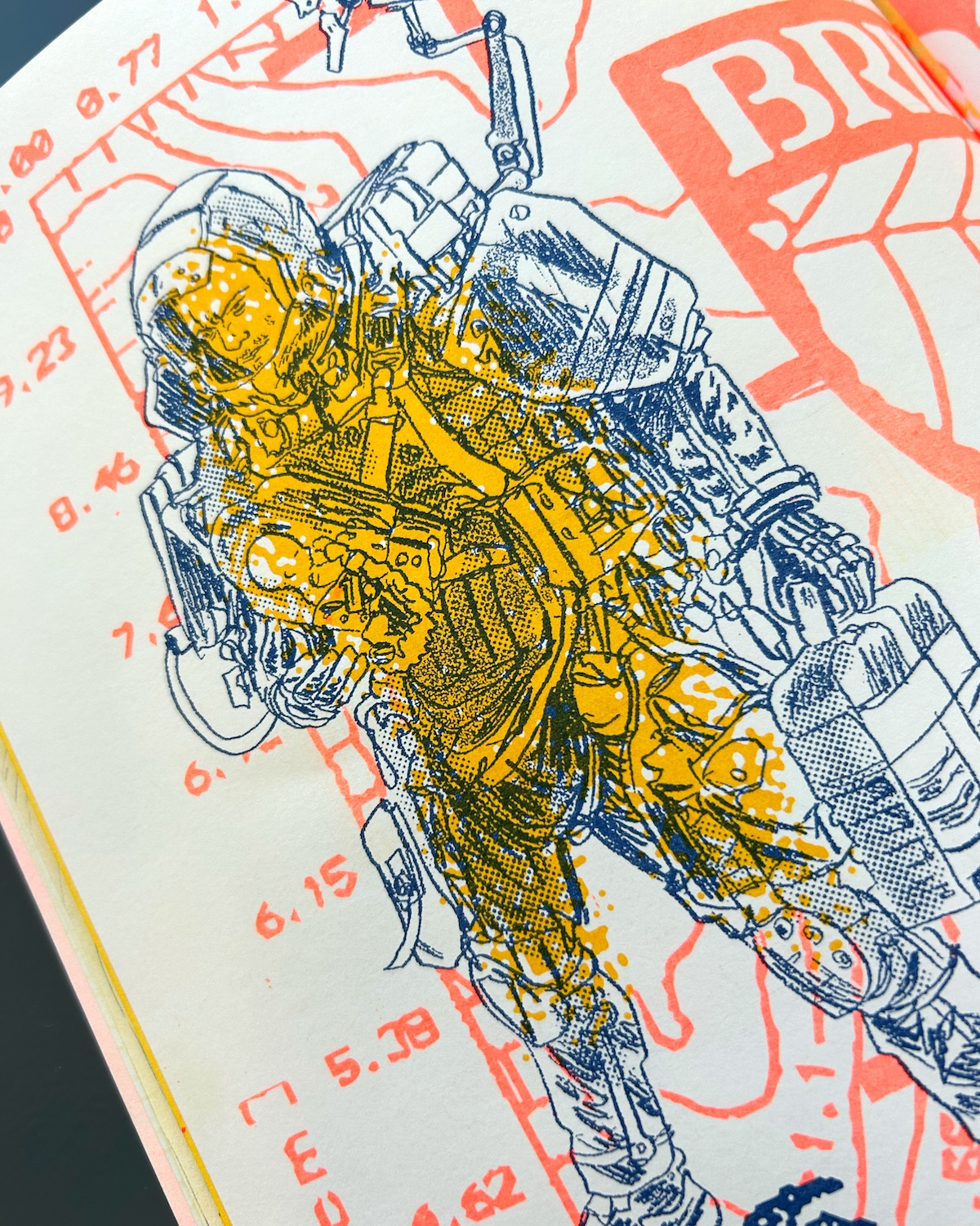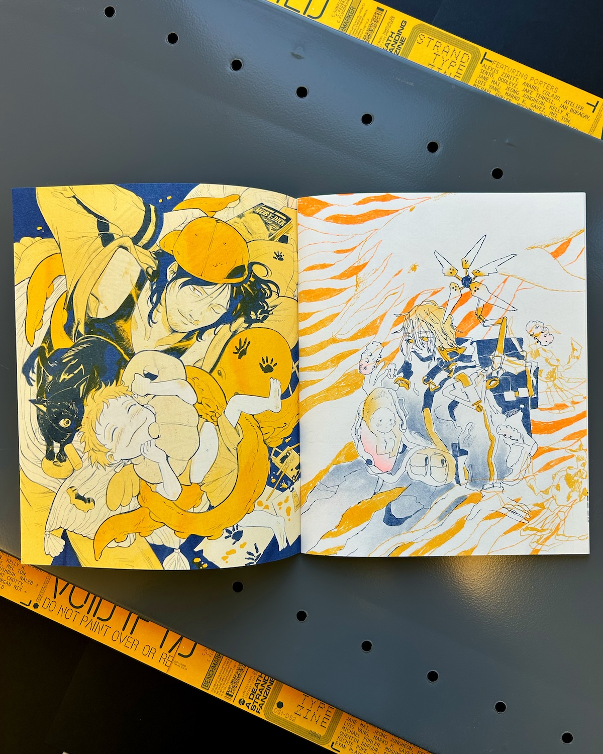 Risograph zine printed with Federal Blue, Fluorescent Orange, & Sunflower.